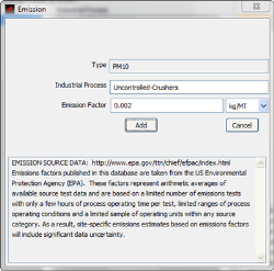 Create New Emission: To create new emission factors, click on Create New Emission button to open the Emission window. Enter the industrial process and the emission factor. Emissions can be changed from metric to Imperial. Changing the units will convert the emission.